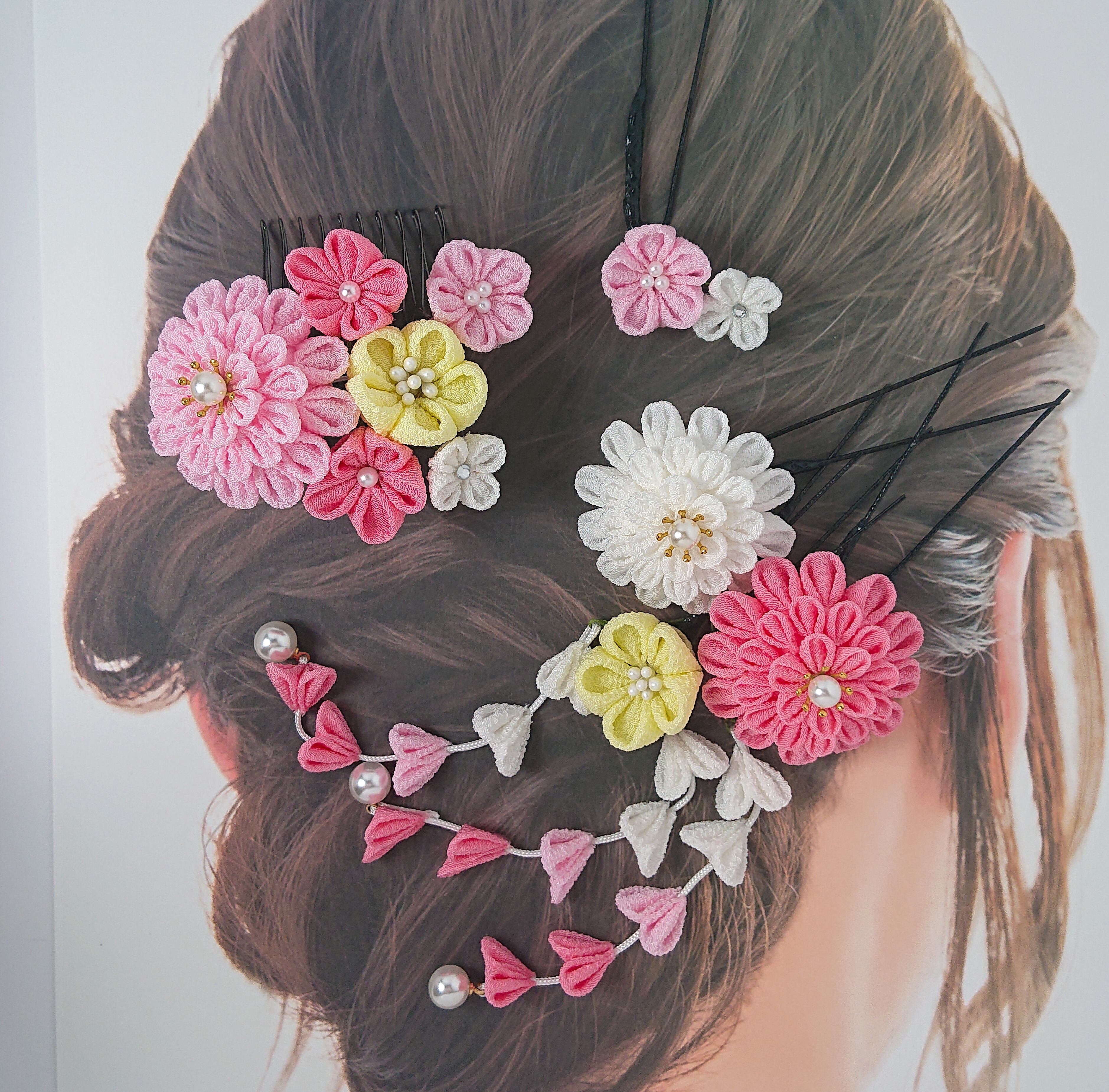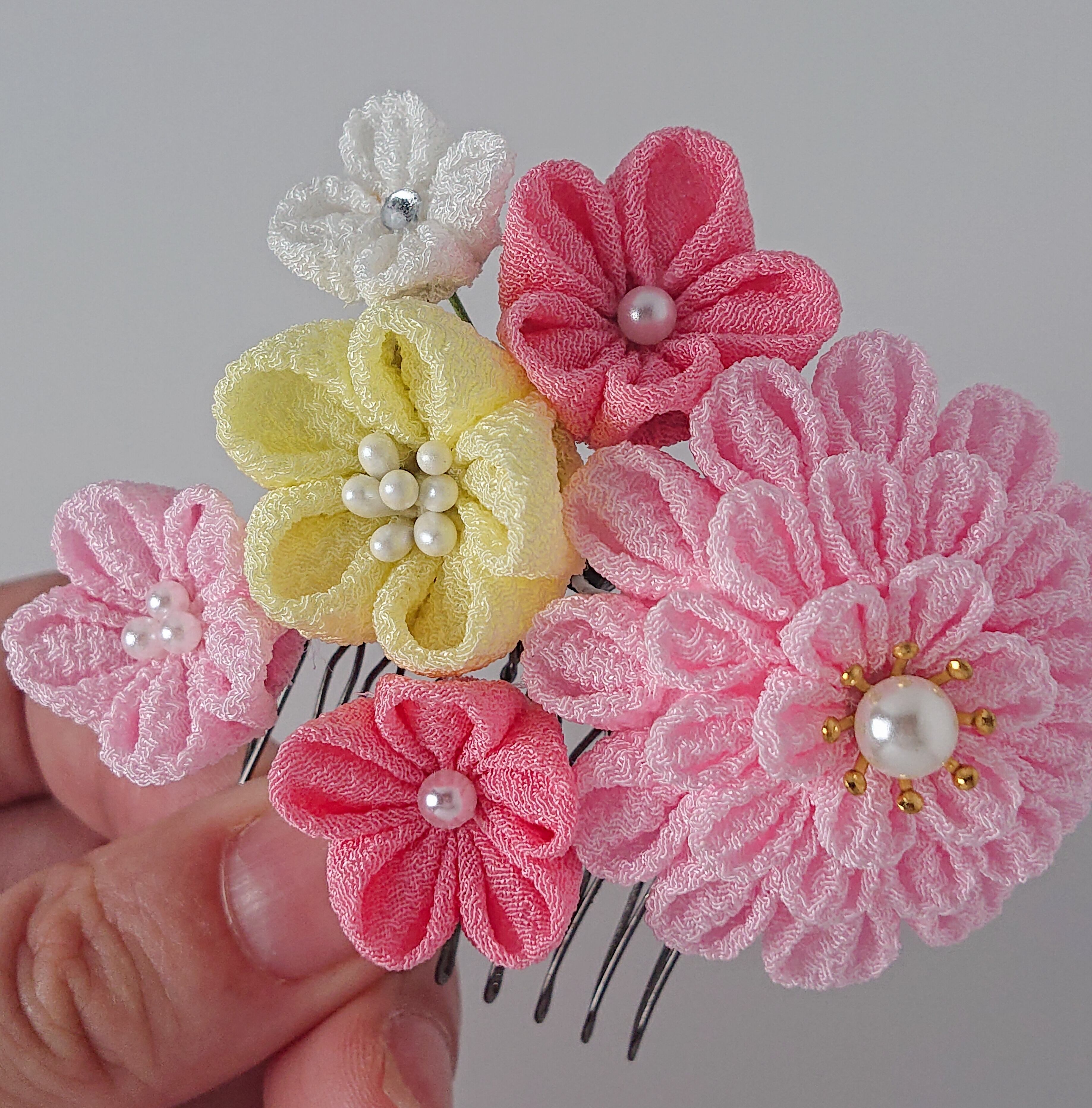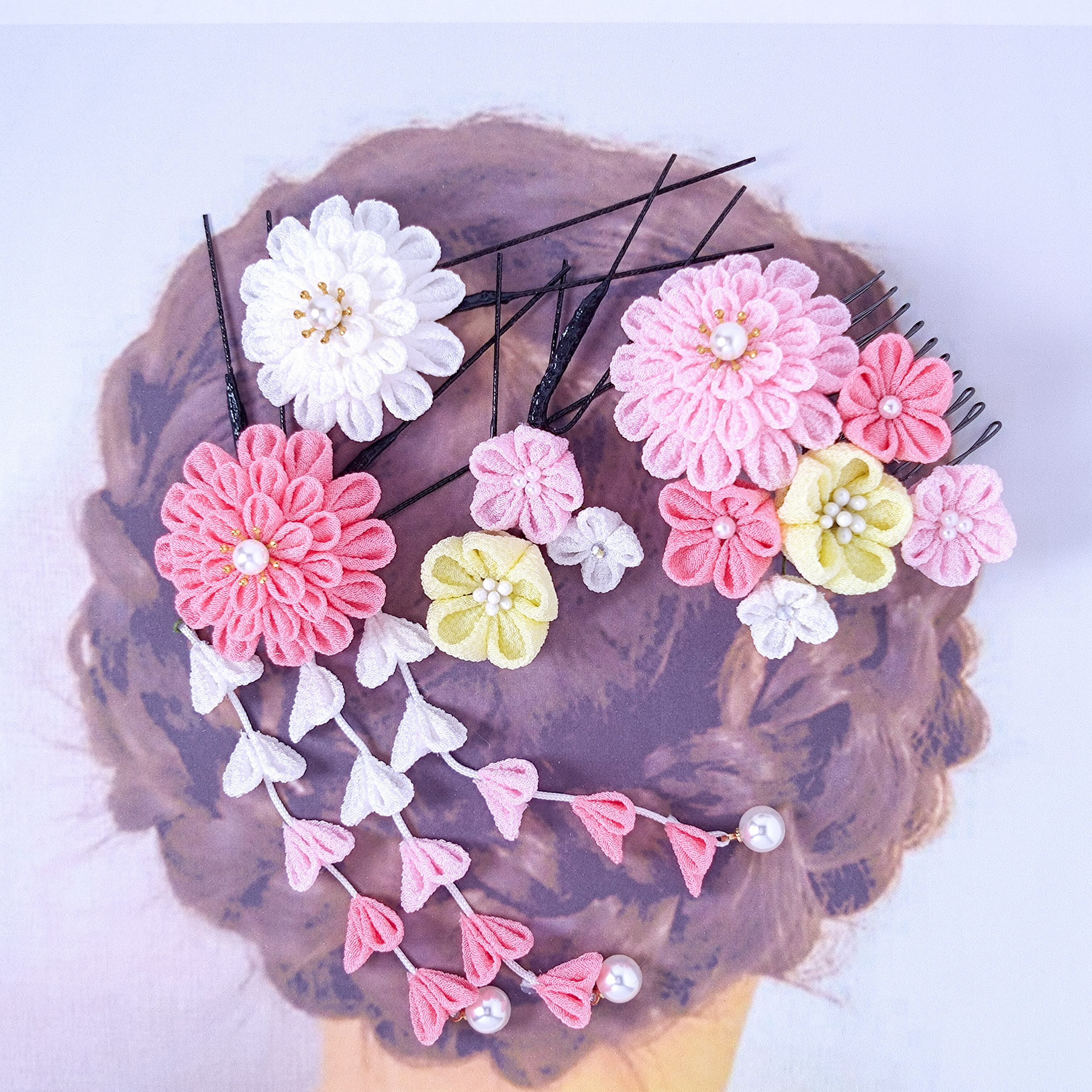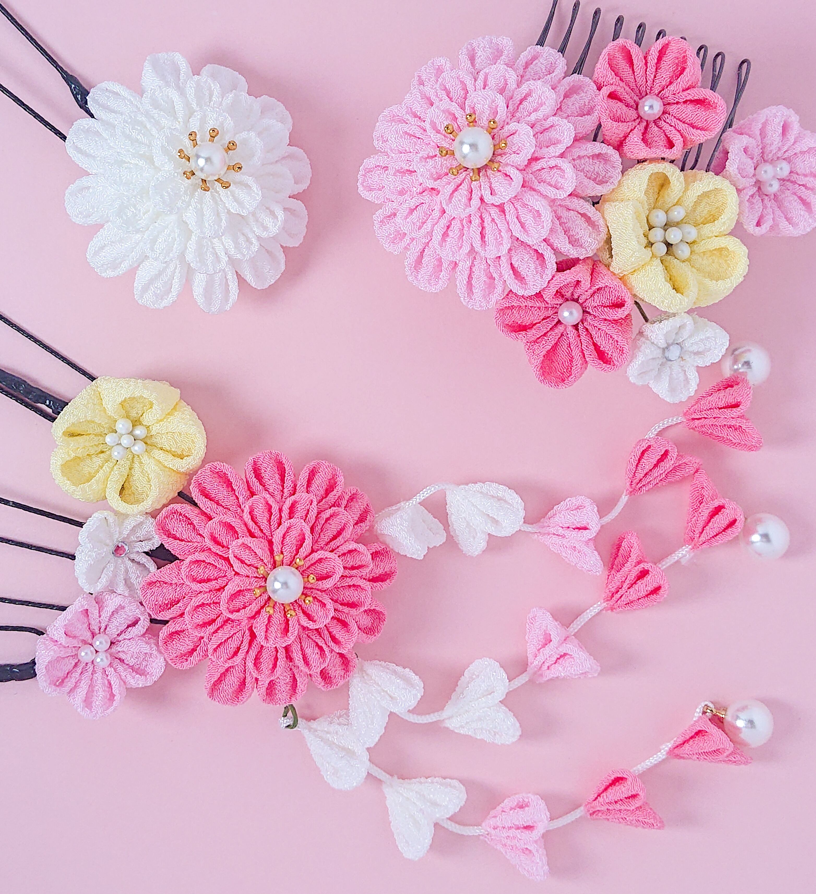 一越ちりめんのピンクグラデと白をメインに作りました。