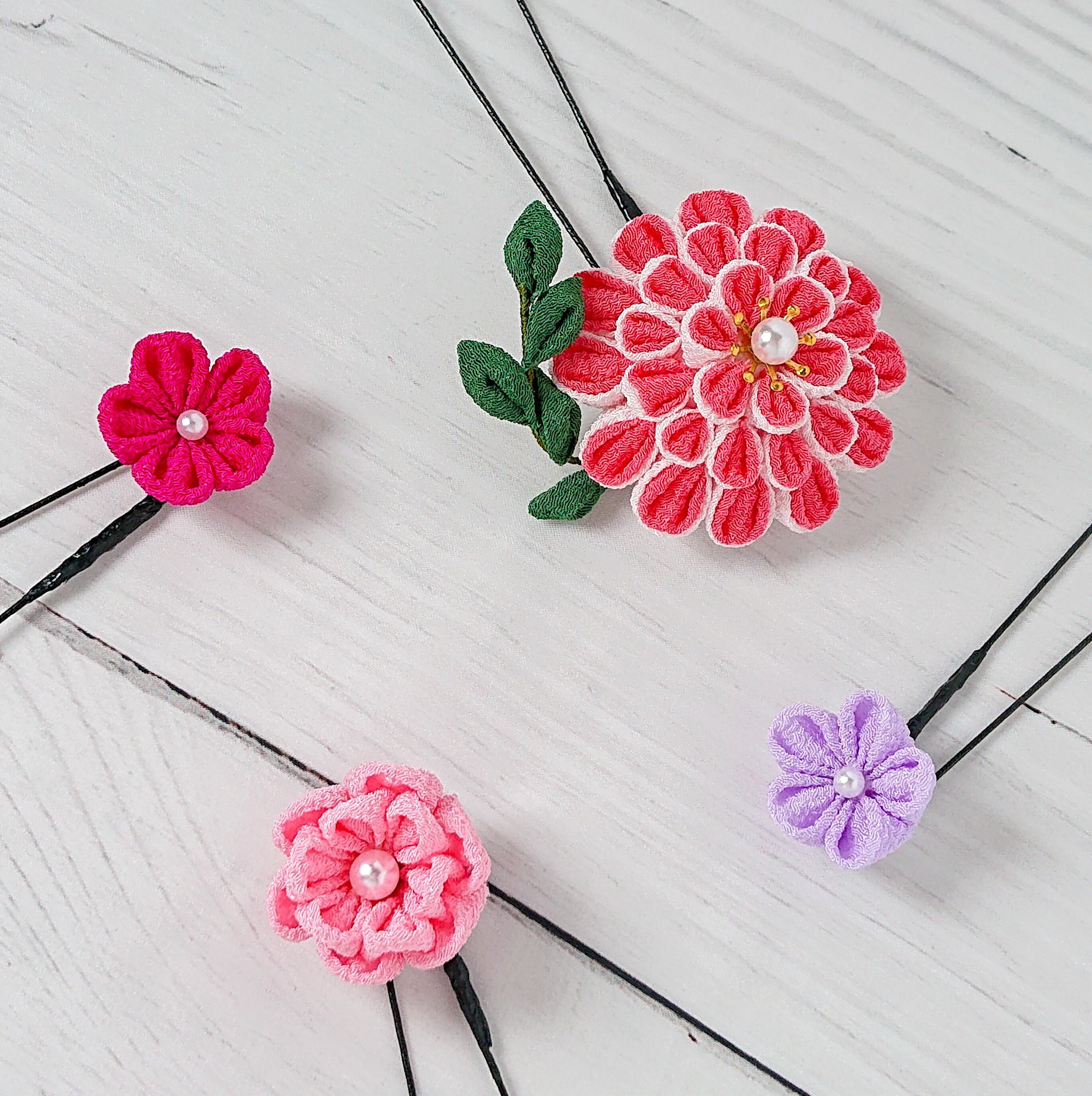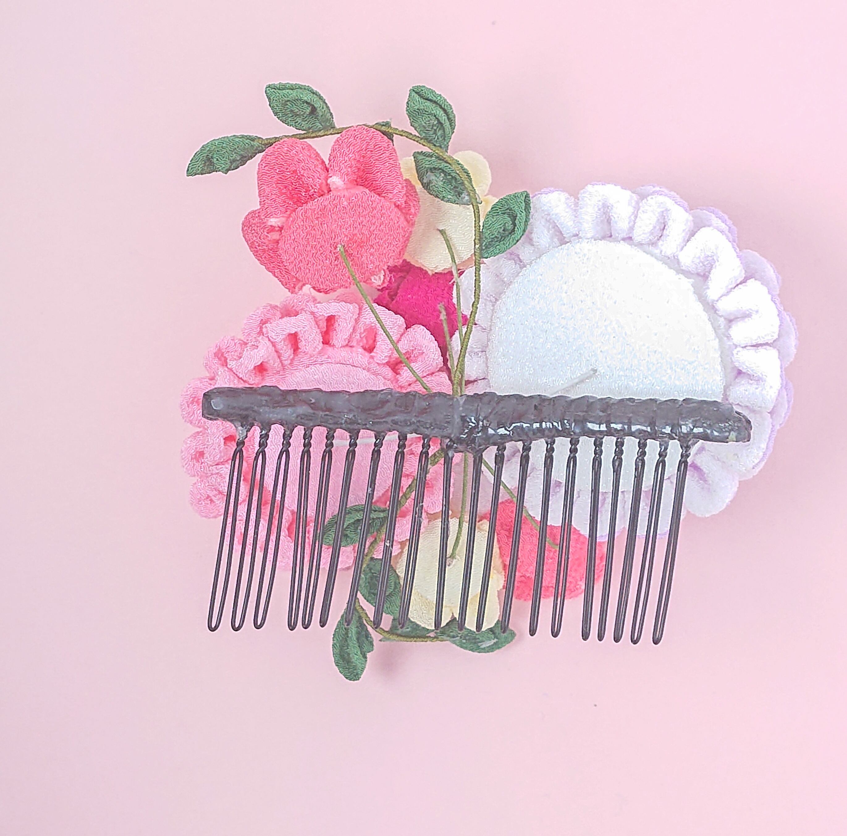 一越ちりめんのつまみ細工で、ピンクをメインに合わせて作りました。